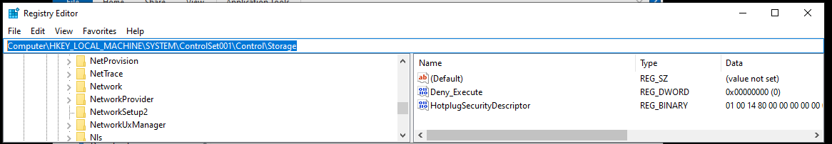 3- Go to: Computer\HKEY_LOCAL_MACHINE\SYSTEM\ControlSet001\Control\Storage and set Deny_Execute to 0.